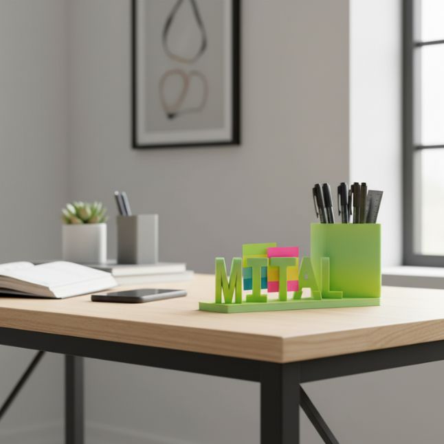Elevate your desk organization and decor with the Dual Illusion Nameplate with Pen Stand. This stylish and functional piece combines a personalized nameplate with a pen holder, making it a perfect gift for professionals, students or home offices.